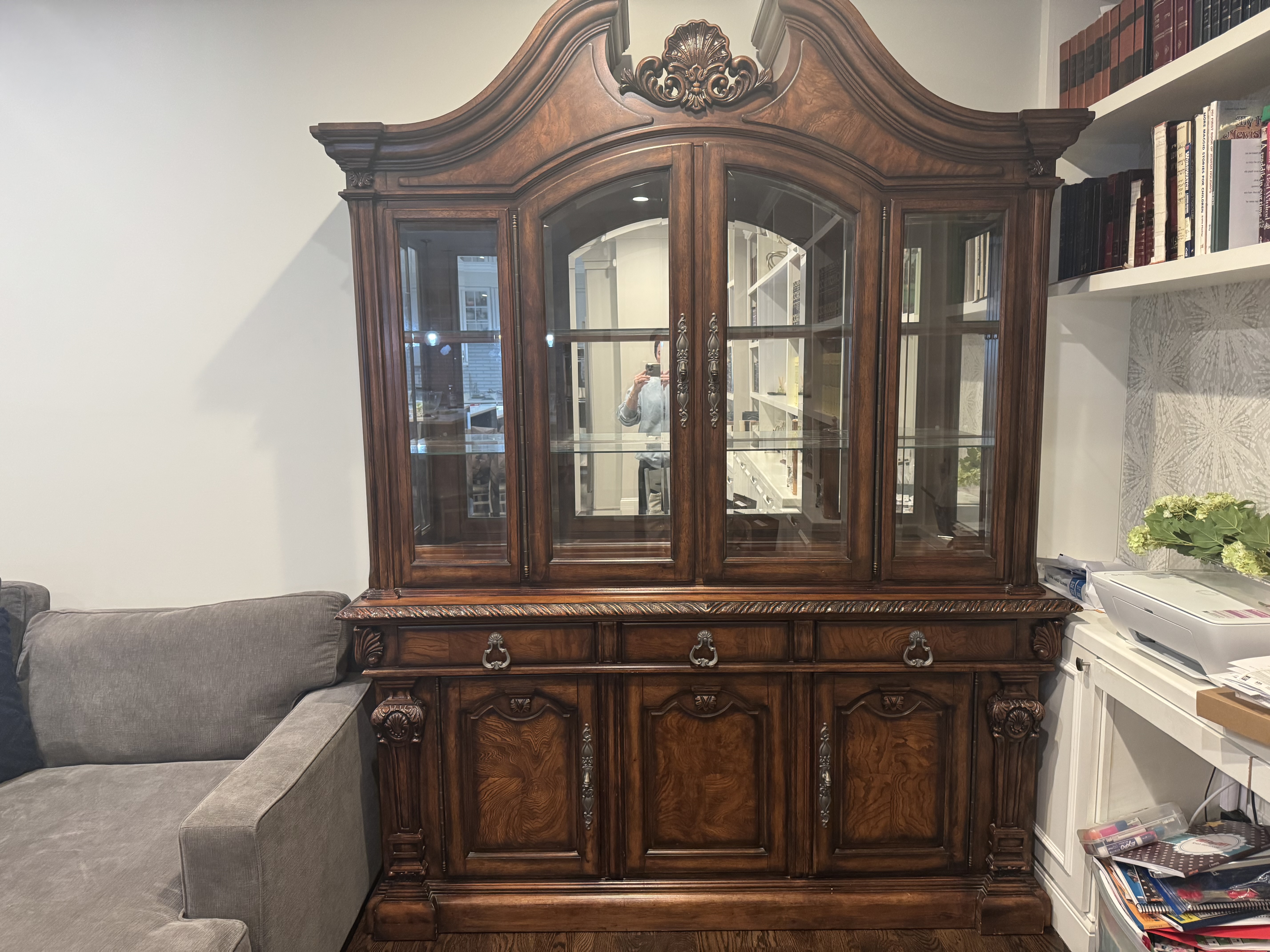 Large china cabinet with glass shelves and storage on the bottom. It is 2 pieces making it easier to carry