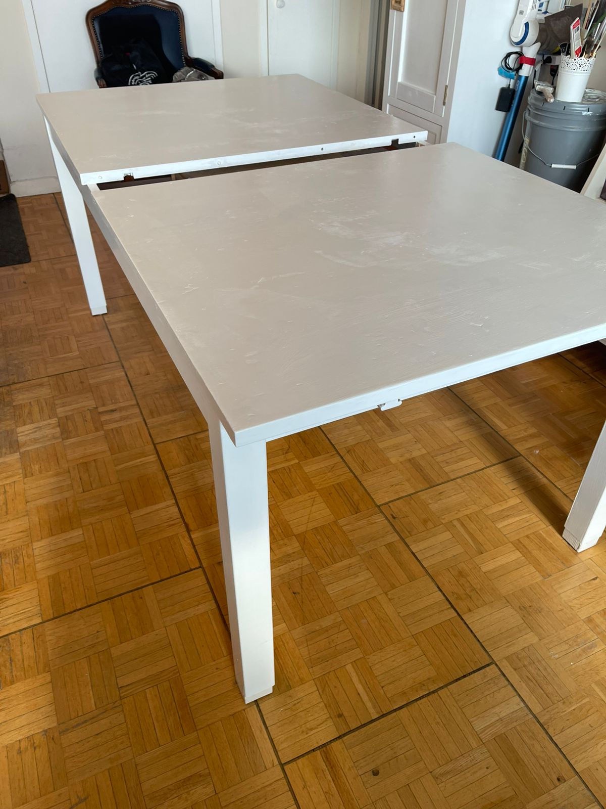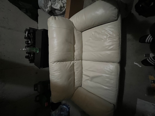 We're offering this white leather loveseat for free to the first person who can pick it up.